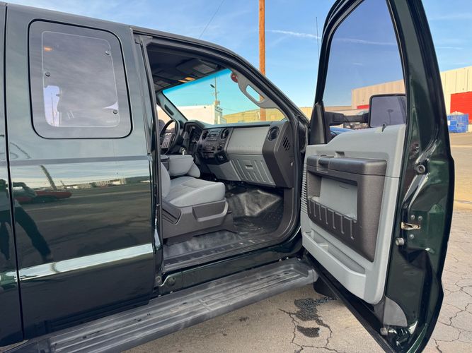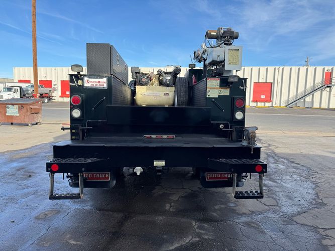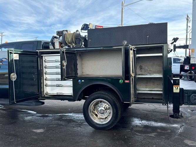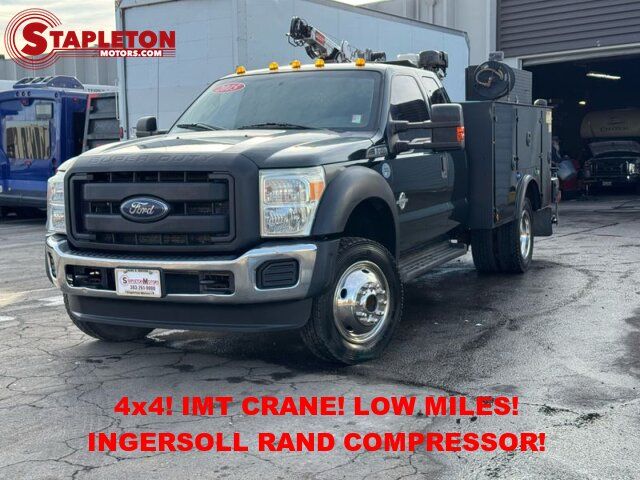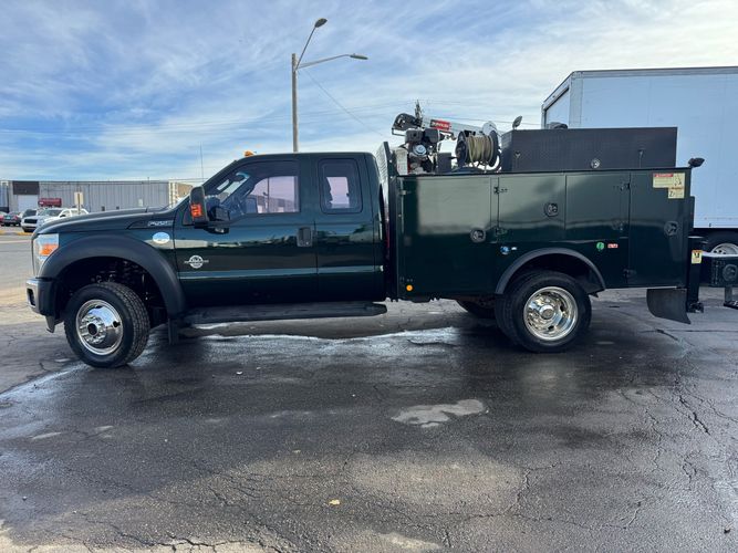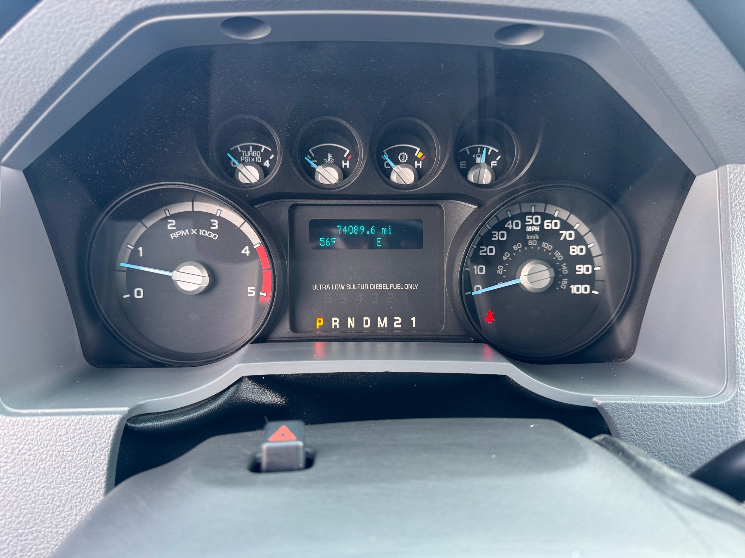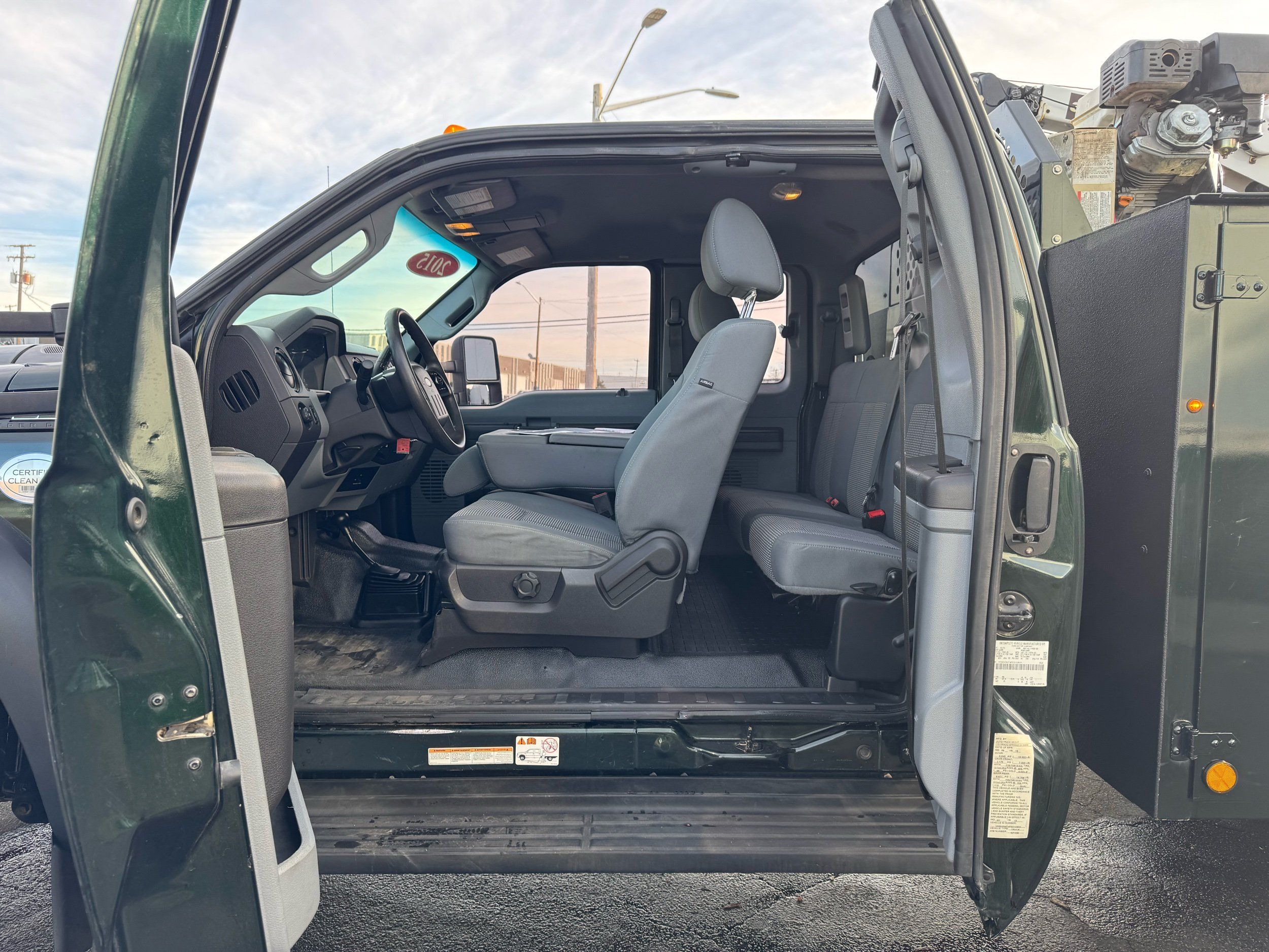 Features: Extended Cab, Cab Lights, Electric Crane, Dual Rear Wheels, Service Body, Running Boards, Signal Integrated Mirrors, Heated Mirrors, Power Locks. Power Steering, Power Windows, Power Mirrors, Mud Flaps, Trailer Package, Tow Hitch, IMT 3203i Crane, Wireless Remote, Diesel Engine, Cloth Seats, Vinyl Floor, Manual Seat, Cruise Control, Hands Free Calling, Low Miles, 74k Miles, CD, MP3, AM/FM, Auxiliary, Bluetooth, Heat, Air Conditioning, Sync System, Four Wheel Drive, Rear Folding Seat, GVWR 19500lb, Front GAWR 7000lb, Rear GAWR 14706lb, Bench Vise, Outriggers, Hose Reel, Ingersoll Rand Compressor, 300HP 6.7L Powerstroke