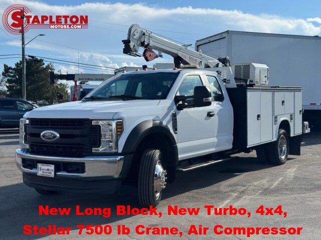 Features: Extended Cab, Service Body, Mud Flaps, Dual Rear Wheels, Crane, Air Compressor, Bench Vise, Utility Bed, Tow Package, Stellar 7630 Crane, Running Boards, Outriggers, New tires, Cab Lights, Strobe Lights, PTO, Heated Mirrors, Power Locks, Power Windows, Power Mirrors, Tilt Wheel, Four Wheel Drive, Manual Seat, Vinyl Seats, Vinyl Floor, GVWR 19500, Front GAWR 7000lb, Rear GAWR 14706lb, Cruise Control, Heat, Air Conditioning, AM/FM, Exhaust Brake, Bluetooth, MP3, USB, Folding Seats, Cobra Power Inverter, Knapheide Bed, 4200lb Winch Rating