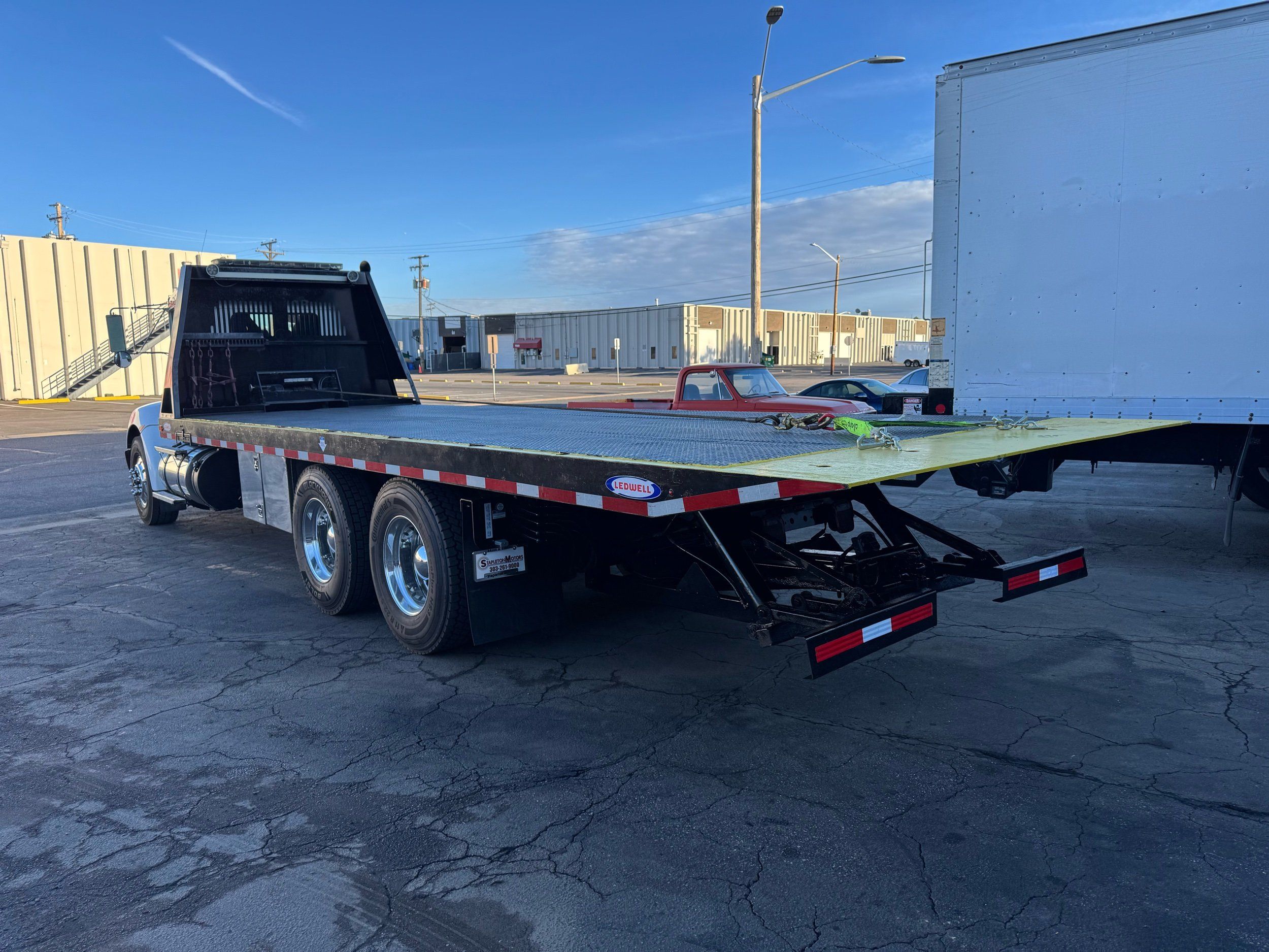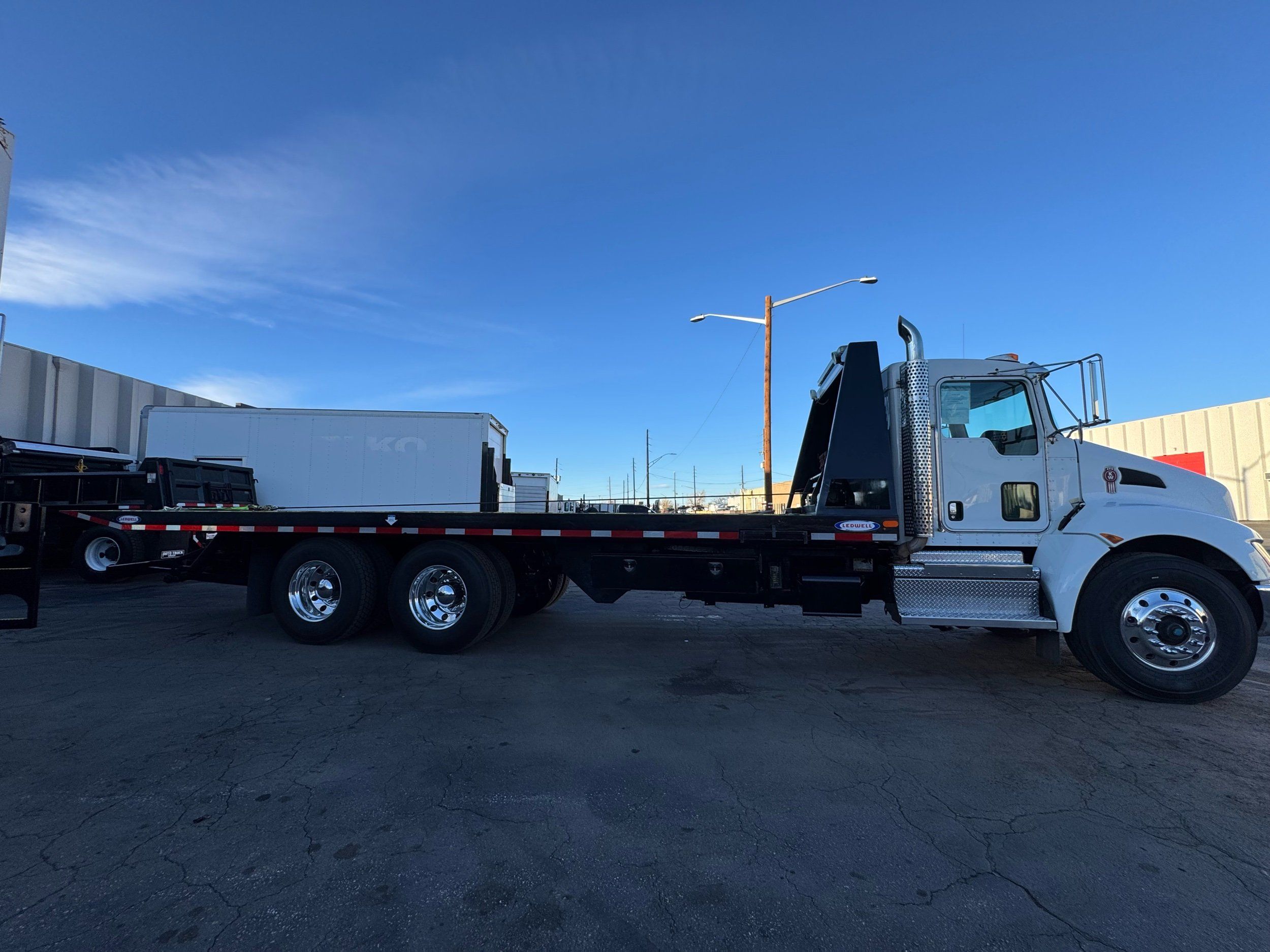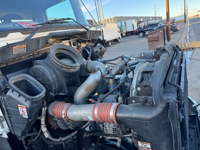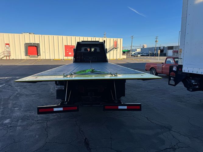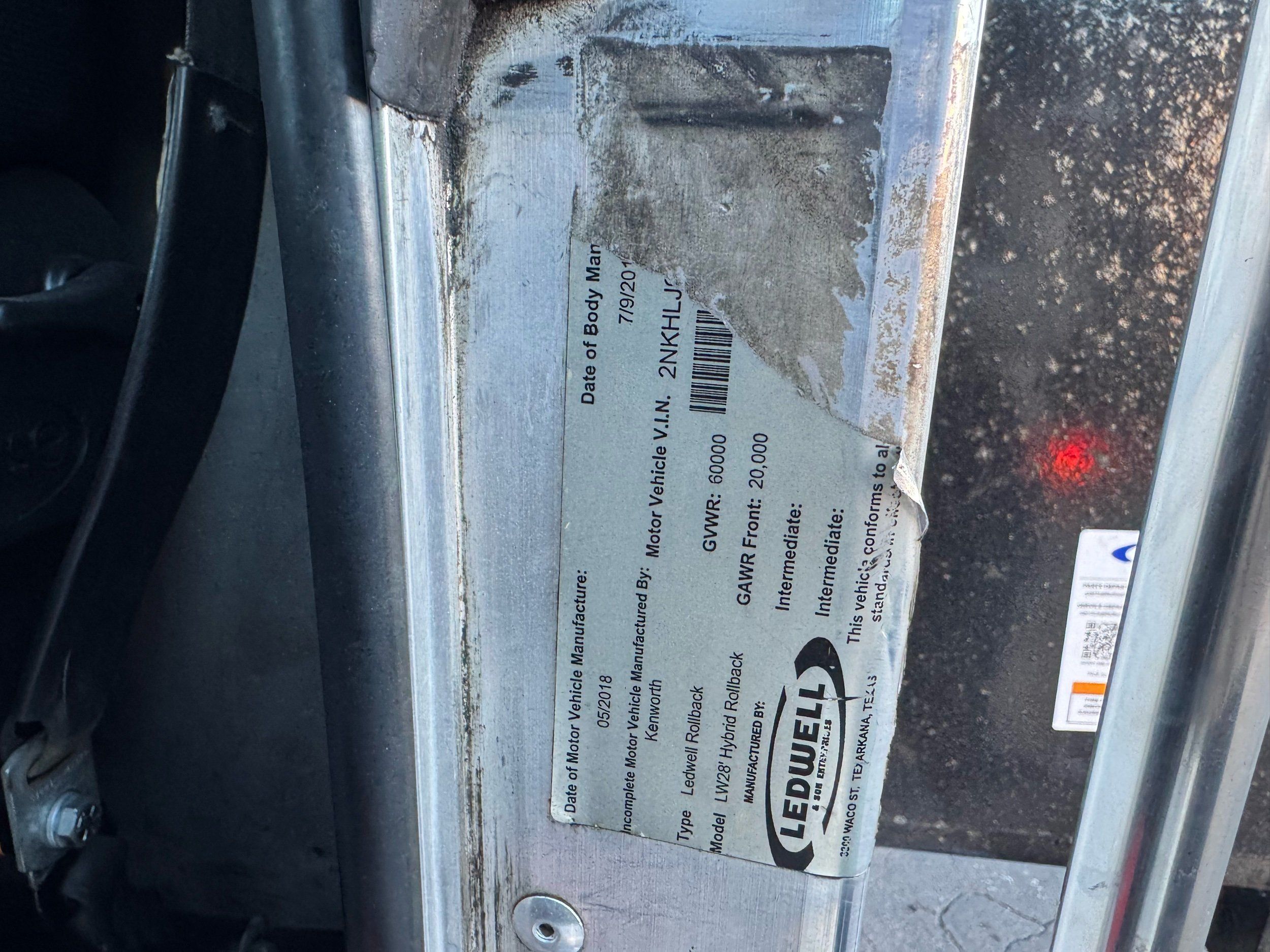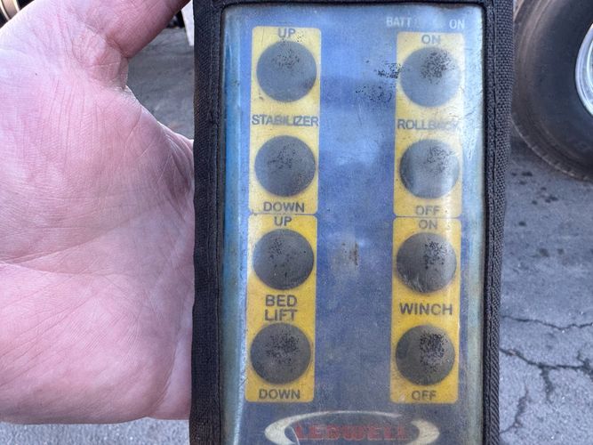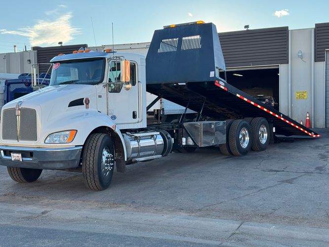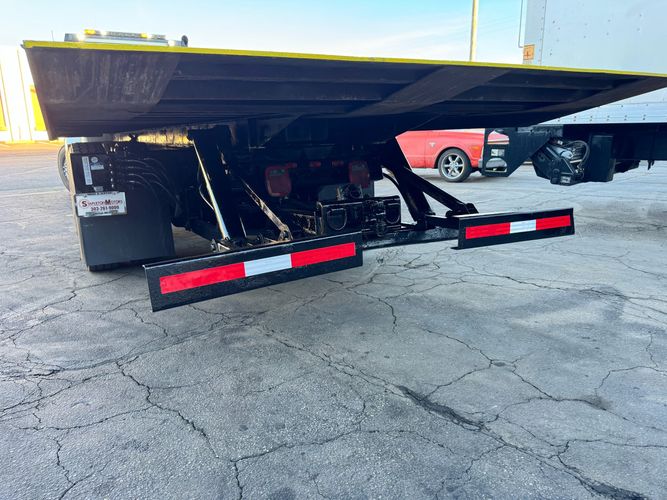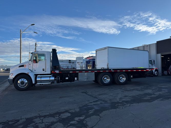 Features: 28ft Rollback, Class 8, Regular Cab, Cab Lights, Work Lights, Strobe Lights, New Tires, Tandem Axle, Mud Flaps, Trailer Package, Tow Straps, New Winch Cable, Storage Boxes, Paccar Engine, Allison Transmission, 350 Horsepower, Power Locks, Power Windows, Air Seat, Cloth Seats, Heated Mirrors, Ledwell Rollback Equipment Mover, GVWR 60000lb, Front GAWR 20000lb, Intermediate GAWR 20000lb, Rear GAWR 20000lb, Air Brakes, 7449 Hours, Heat, Air Conditioning, Automatic Transmission, AM/FM, Bluetooth, USB, Auxiliary, Cruise Control, PTO, Remote Operated Bed, Vinyl Floor, Spring and Air Bag Suspension, Dual Piston Bed, Fresh Service